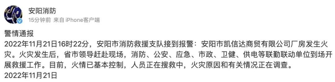 @安陽消防 微博發布警情通報,2022年11月21日16時22分,安陽市消防救援支隊接到報警:安陽市凱信達商貿有限公司廠房發生火災。火災發生后,省市領導趕赴現場,消防、公安、應急、市政、衛健、供電等聯勤聯動單位到場開展救援工作。目前,火情已基本控制,人員正在搜救中,火災原因和有關情況正在調查。