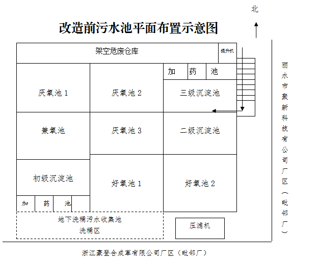 1.污水池項目。可思克公司產(chǎn)生的廢水主要為設(shè)備清洗廢水、成品包裝桶清洗廢水、地面沖洗廢水等,產(chǎn)生的廢水經(jīng)處理后大部分回用于生產(chǎn)車間,基本不外排。該公司主要原輔材料包括順丁烯二酸酐、馬來酸、醋酸乙烯、苯乙烯、山梨醇、乙二醛、馬來酸、糊精、丙烯酸丁酯、淀粉、尿素等。根據(jù)《浙江可思克高新材料股份有限公司年產(chǎn)40000噸造紙化學(xué)品搬遷擴建項目竣工環(huán)境保護驗收監(jiān)測報告(QX(竣)2018048)》,公司生產(chǎn)廢水各主要污染物產(chǎn)生濃度約為:COD1816mg/L、氨氮121mg/L、石油類1.11mg/L、SS 153mg/L、總氮182mg/L、苯乙烯0.54mg/L。根據(jù)企業(yè)原輔材料分析,企業(yè)廢水沉積物(污泥)里的有機物在厭氧處理單元硫酸鹽還原細菌(SRB)等厭氧菌作用下發(fā)酵分解產(chǎn)生硫化氫、甲烷等有害氣體。硫化氫(相對分子質(zhì)量為34)重于空氣(相對分子質(zhì)量為29)且較易溶解于水,故硫化氫容易在厭氧池內(nèi)沉積富集。企業(yè)厭氧池長期運行未清理且表面板結(jié),導(dǎo)致硫化氫等有害氣體在厭氧池內(nèi)持續(xù)富集。該企業(yè)改造前污水處理工藝流程如下圖: