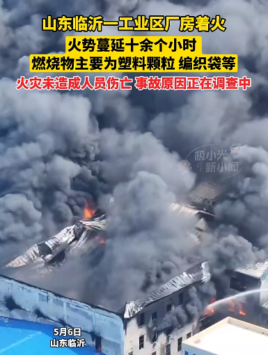 5月6日,山東臨沂一工業園區廠房發生火災,現場濃煙滾。經核實,著火位置位于廠房建筑3層,燃燒物主要為塑料顆粒、編織袋等。截至15時30分,火勢被控制未造成人員傷亡。