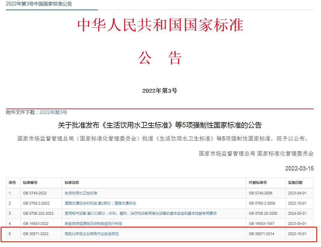 新版強制性標準:GB?30871-2022《危險化學品企業特殊作業安全規范》發布!2022年10月1日起實施!