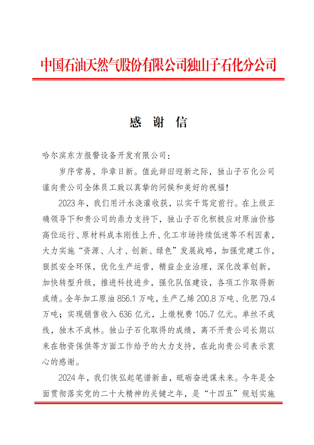 近日,東方報警收到了中國石油天然氣股份有限公司獨山子石化分公司的感謝信,表達(dá)了對我司產(chǎn)品和服務(wù)的認(rèn)可和感謝。