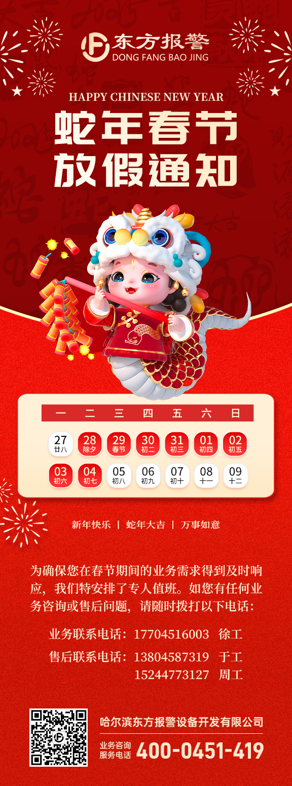 在歲末的暖陽(yáng)中,我們即將告別充實(shí)的一年,迎來(lái)充滿(mǎn)希望的 2025 年。在此,哈爾濱東方報(bào)警設(shè)備開(kāi)發(fā)有限公司向您致以最親切的問(wèn)候和最誠(chéng)摯的新年祝福!回首過(guò)去一年,東方報(bào)警在大家的共同努力下,取得了令人矚目的成績(jī)。我們的產(chǎn)品在市場(chǎng)上的認(rèn)可度不斷提升,服務(wù)范圍持續(xù)拓展,這一切都離不開(kāi)每一位客戶(hù)的信任與支持,以及全體員工的拼搏與奉獻(xiàn)。