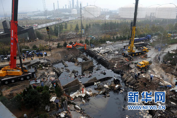 2013年11月24日拍攝的位于青島經(jīng)濟(jì)技術(shù)開發(fā)區(qū)秦皇島路與齋堂島街交會(huì)處的事故現(xiàn)場(chǎng)。