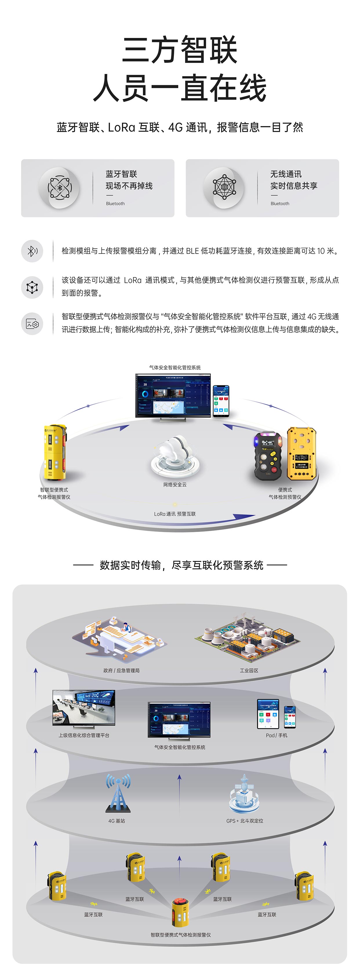 2.預警互聯350米,預警互聯內容:中文語音播報佩戴便攜人員信息、固定表位號、氣體種類、氣體濃度;